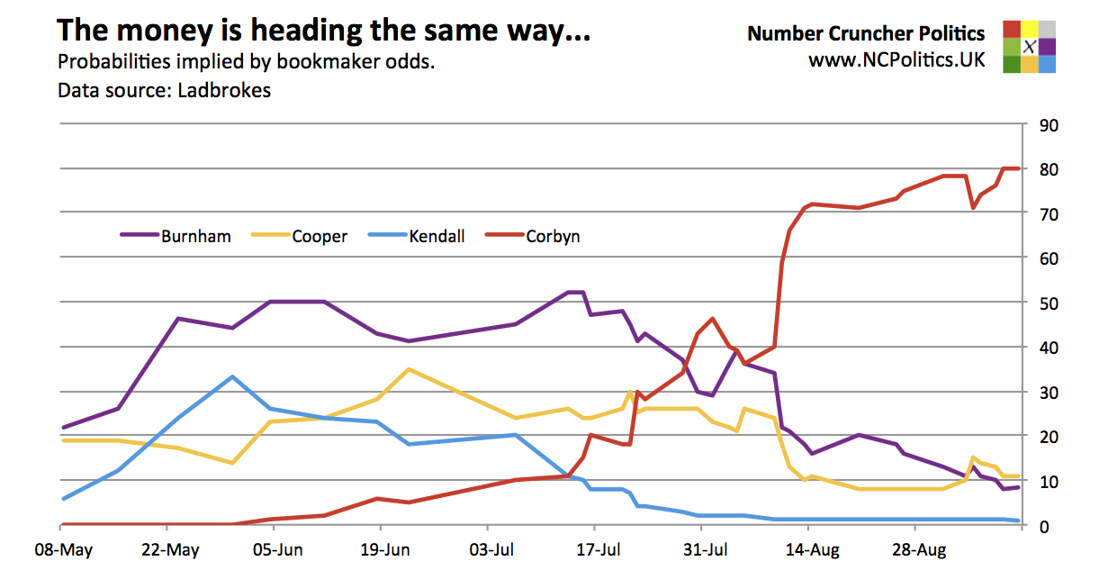 The money is heading the same way... Probabilities implied by bookmaker odds. Data source: Ladbrokes