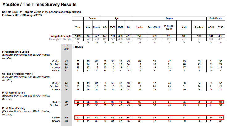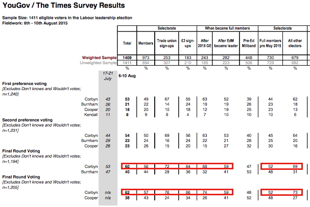 But there’s a broader point to be made regarding weighting, as well as sample bias and differential turnout. These threats are greatest when support varies wildly between crossbreaks. But the striking thing about Corbyn support is how broad it appears to be. In the second poll, Corbyn wins decisively among men and women, across age groups, regions and socioeconomic groups, and with each category of voter. Within full members, he loses among the pre-2010 cohort, but not by much. This similarity between subsets of voters greatly reduces the chances of these problems materialising.