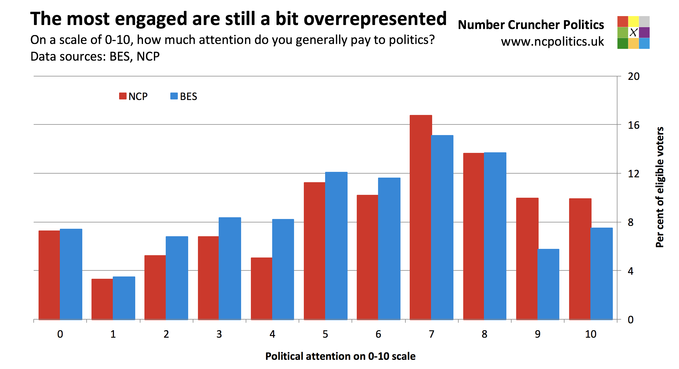 And on political attention, measured on an 11-point scale from zero (pay no attention) to 10 (pay a great deal of attention), we sampled slightly too many people in the most engaged buckets 9 and 10 and slightly too few in the less engaged buckets 2-4. This is something we’ll look into with a view to improving, and it may well explain the slight (0.5 point) turnout overestimate relative to the BES. Importantly however, the sums of the 5-8 range (where most voters are) and the 0-2 range (which contains almost half of non-voters) were spot on, and the errors mentioned above are still a lot smaller than usual.