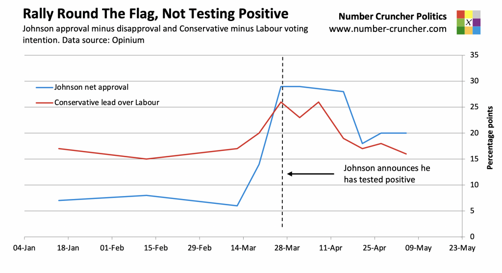What actually appears to have happened is that support for both Johnson and his party increased gradually during the first half of March and then increased very sharply in the third week of March, as a rally round the flag took hold.